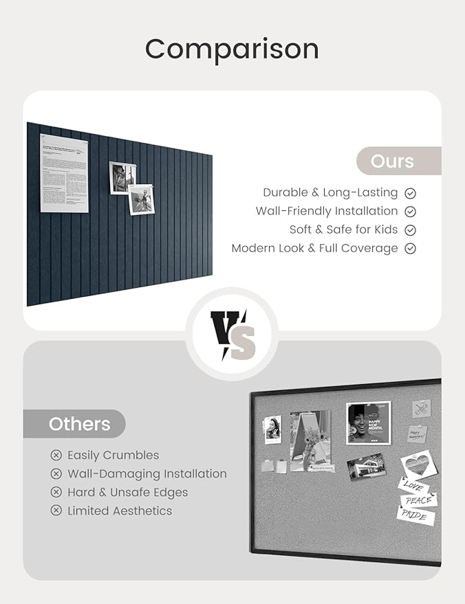 - 【Felt Bulletin Board – 6 Tiles Included】 Includes 6 felt cork boards (each 11.8" x 11.8") with 30 Pushpins that can be freely arranged into a large display board. Perfect for showcasing your schedules, ideas, and creations in home or office settings.