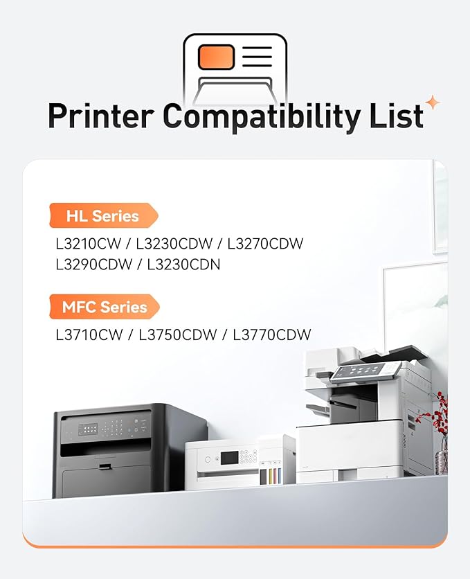 - Compatible Devices : Compatible with Brother HL Series Printer:HL-L3210CW HL-L3230CDW HL-L3270CDW HL-L3290CDW HL-L3230CDN; Compatible with Brother MFC Series Printer:MFC-L3710CW MFC-L3750CDW MFC-L3770CDW. Compatible with Brother HL Series Printer:HL-L3210CW HL-L3230CDW HL-L3270CDW HL-L3290CDW HL-L3230CDN; Compatible with Brother MFC Series Printer:MFC-L3710CW MFC-L3750CDW MFC-L3770CDW.