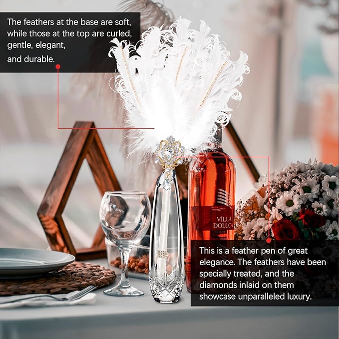 - 【Dual-Feather Luxury Design】 CROWN GUIDE's feather pen features a cloud-like cluster of hand-curled goose feathers accented with gold chains, paired with a satin-wrapped barrel for sophisticated wedding guest book signing and vintage desk styling.