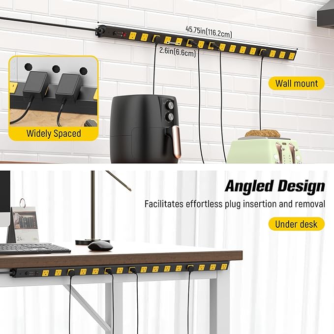 - Wall Mount Power Outlet Strip - Heavy duty power strip with surge protection come with 2 mounting holes to mount on the wall,with vertical or horizontal installation, for workshop, commercial, shop, industrial, garage workbench, networking and telecom applications