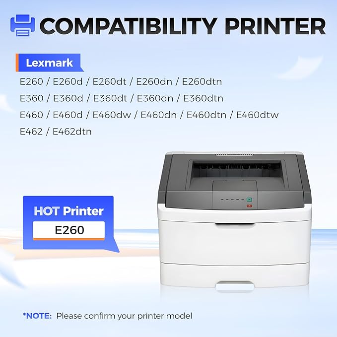 - Compatible Printer: Compatible with Lexmark E260 E260d E260dt E260dn E260dtn E360 E360d E360dt E360dn E360dtn E460 E460d E460dw E460dn E460dtn E460dtw E462 E462dtn Printer.