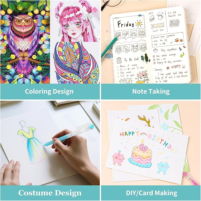 - 【 Multi-Purpose Usage】The gel pen set is an ideal art supply for adults and kids, perfect for coloring books, bullet journaling, sketching, drawing, writing, comics, and any other designs on Scrapbooks, School Projects, Party Invites, Greeting Cards, DIY Decor, Letters to Friends or Family.
