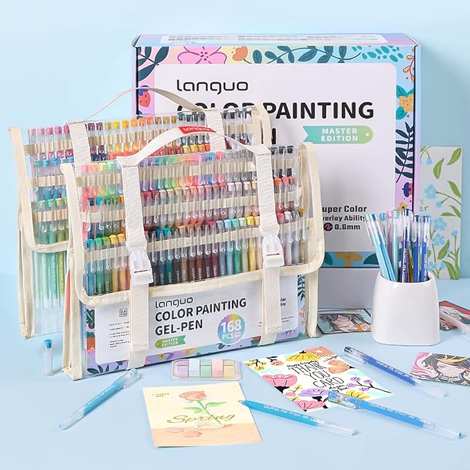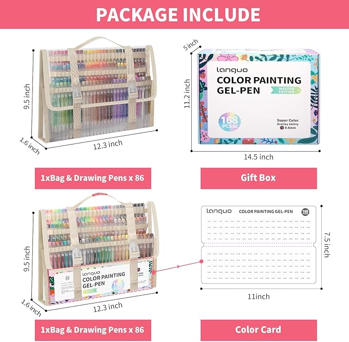 - 【Gift Box-168PCS Gel Pens 】You'll receive a beautiful gift box for your loved ones. Our gift box includes 168 colored pens (158 unique colored pens, 4 black pens, 2 white pens, 2 silver pens, 2 gold pens), and 2 transparent bags, which can meet your color needs for drawing on white and dark papers.
