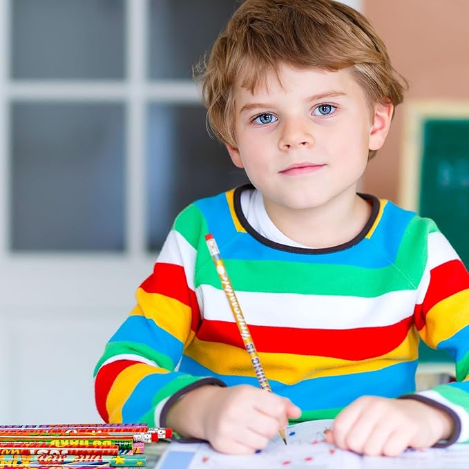 - Cute & Fun DesignsοΌEach pencil is decorated with bright, cheerful patterns, including Inspirational saying, stars, and fun messages that inspire young learners. Kids will love using these pencils for drawing, writing, and school activities