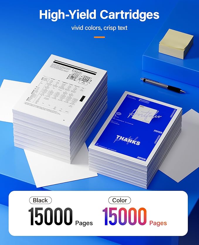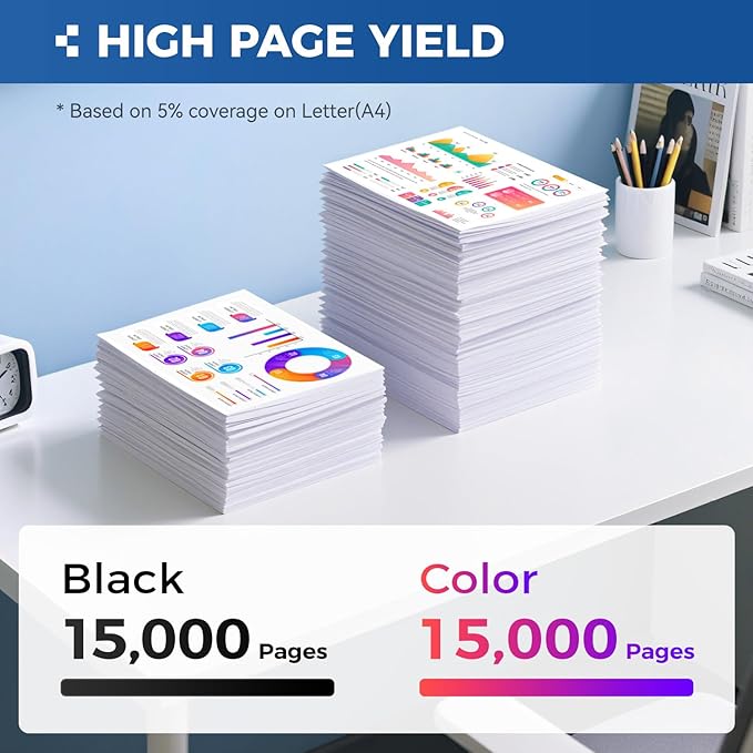 - Page Yield: Up to Black is 15,000 pages per black cartridge and Color is 15,000 Pages per color cartridge (Letter/A4, at 5% Coverage).