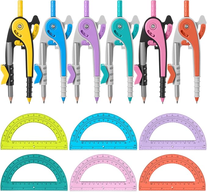 - 6 Compass and Protractor Set: Compasses and protractors are suitable for drawing circles and measuring angles, including six colors of red, pink, yellow, blue, green, and purple, with bright color combinations, the compass comes with round corner design on compass needle, safe and reliable to use without worrying about scratching, suitable for students, teachers, engineers, designers, artists, etc
