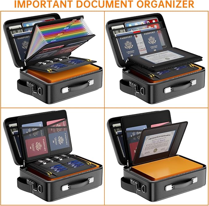 - Large-capacity: Outside size: 15.2" x 11.22" x 5.3".Internal size: 14.8" x 10.8" x 4.5". Our fireproof document box adopts a multi-layer design that can meet all your storage needs.These include 13 accordion colorful pockets with labels,1 zipper pocket,4 pen slot,14 card slots,4 passport holder,4 small mesh bags,4 mesh bags,and 1 main pocket. It can store your important documents,money,passport,U Disk,cards,laptop,certificates in a safe and orderly way. Perfect for daily file filing and storage