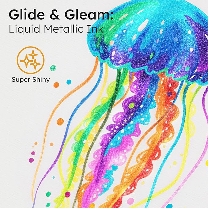 - SHINY METALLIC MARKERS: Create a sparkling metallic effect with glitter-infused ink on any surface—paper, rocks, glass, Christmas ball, wood, pumpkin or plastic. Shines uniquely in every light, and with one swipe your craft shimmers.