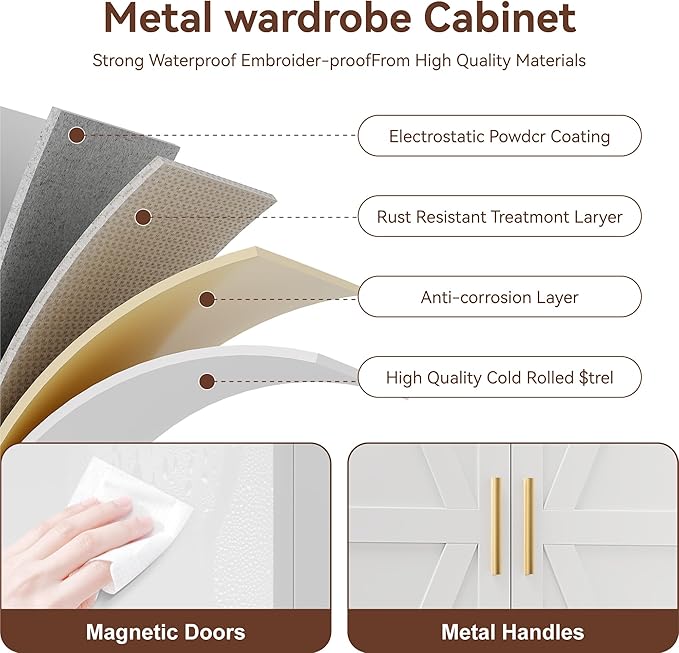 - Easy Assembly:With simple step-by-step instructions and labeled parts, this metal armoire unit is a breeze to assemble. Wipe clean with a dry cloth for maintenance. If you have any questions about our wardrobe or their operation procedures, please contact us