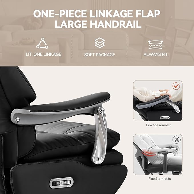 - Independent Backrest and Footrest Electric Adjustment: This electric reclining executive office chair with a footrest features a unique dual-motor system, allowing you to easily adjust the backrest and footrest angles independently using the control buttons. With a 160° big reclining backrest, you can find your perfect angle with a single press. Whether working, relaxing, sitting cross-legged, bending your knees, or reclining for a quick nap, this chair meets all your posture needs. It’s the perfect choice for a comfy computer chair or high-back home office desk chair.
