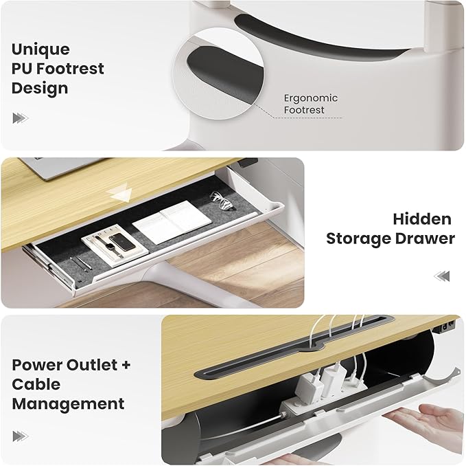 - Hidden Drawer & Organized Workspace: Unlike most standing desks, this one includes a large built-in drawer (25" wide) for easy storage of laptops, notebooks, and accessories. Combined with a rear cable tray + desktop grommet, it keeps your workstation clean, organized, and distraction-free.